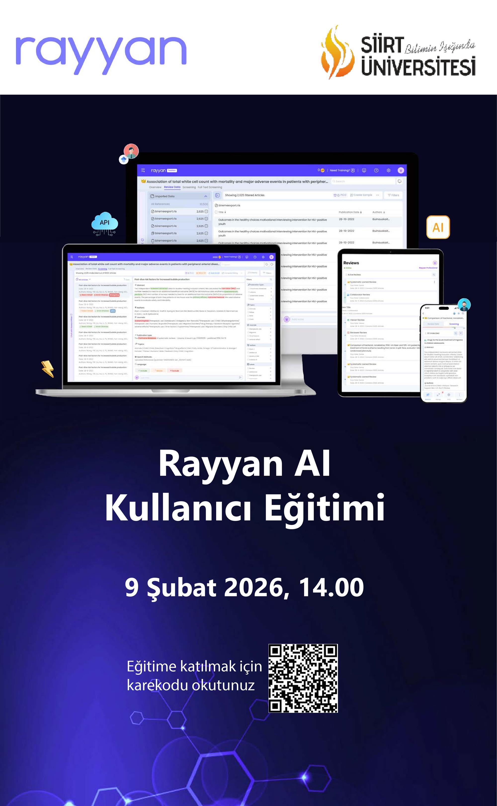 Değerli Araştırmacılar, 9 Şubat 2026 saat 14.00’da Rayyan AI güçlendirilmiş sistematik literatür inceleme ve yönetim platformu (Yapay Zeka Platformu) veritabanı için online kullanıcı eğitim webinarı düzenlenecektir.